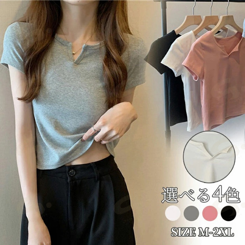 Tシャツ レディース カットソー Vネック 半袖シャツ 半袖 トップス ベーシック シンプル タイト カジュアル 夏 大人 トレンド プルオーバー 女性用 ショート丈 短め 通勤 通学 着やせ 高校生