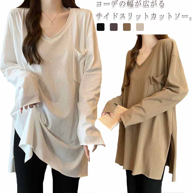 チュニック ロングTシャツ ロンT サイドスリット 長袖 Vネック レディース トップス カットソー Tシャツ プルオーバー レイヤード ドロップショルダー 体型カバー 大き 重ね着