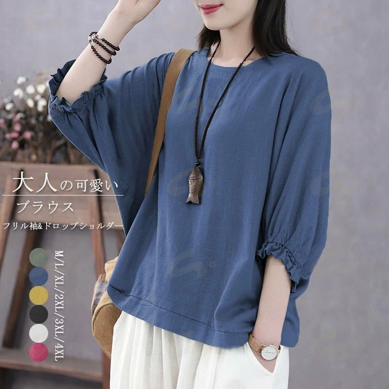ブラウス 五分袖 シャツ レディース ブラウス トップス フリル袖 半袖 シャツ ドルマン ドロップショルダー シャツブラウス 大きいサイズ アウター 体型カバ