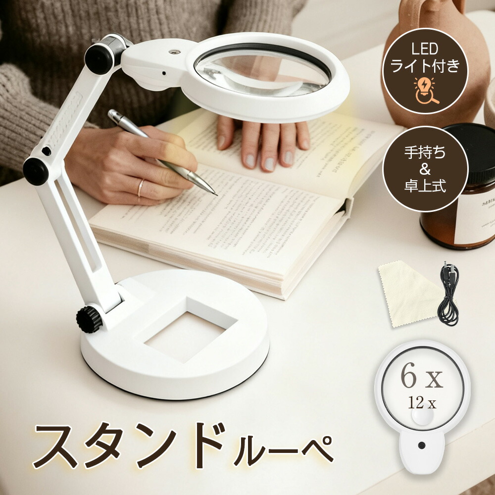 拡大鏡 led ルーペ ライト付き 6倍 12倍 スタンド 折りたたみ 伸縮アーム 2WAY USB給電 乾電池 手持ち式 3色切替 コンパクト 卓上式