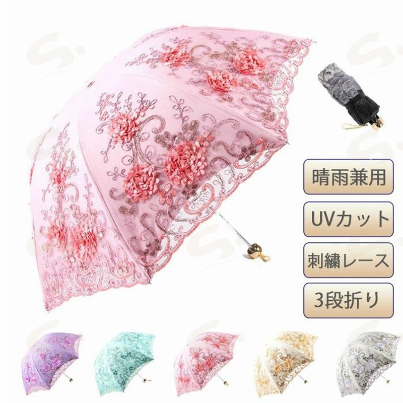 日傘 晴雨兼用 刺繍 レース 折りたたみ 折りたたみ傘 8本骨 3段折り 携帯便利 軽量 可愛い 傘 男女兼用 梅雨対策 超撥水 UVカット 紫外線対策 プリンセス 大きめ 手動開閉 撥水加工