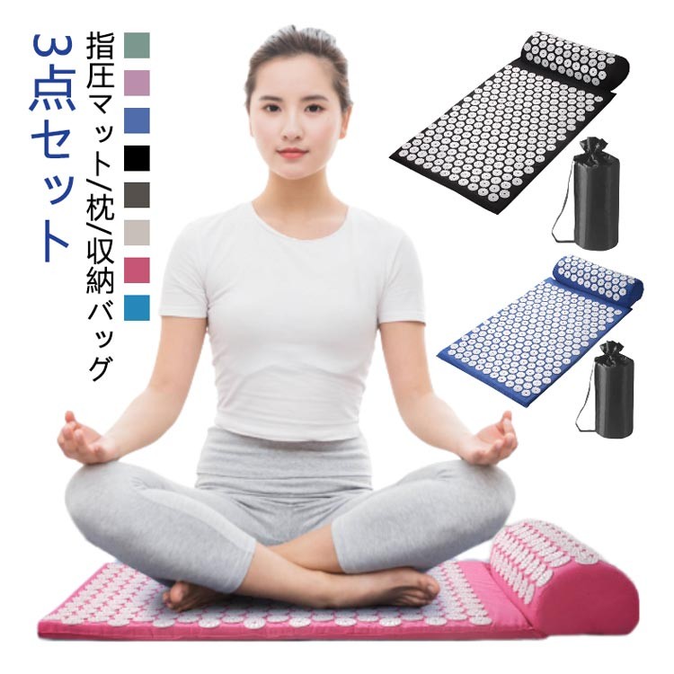 指圧マットと枕、ヨガマットの3点セット。自宅でリラックスと血行促進に。収納バッグ付きで便利。