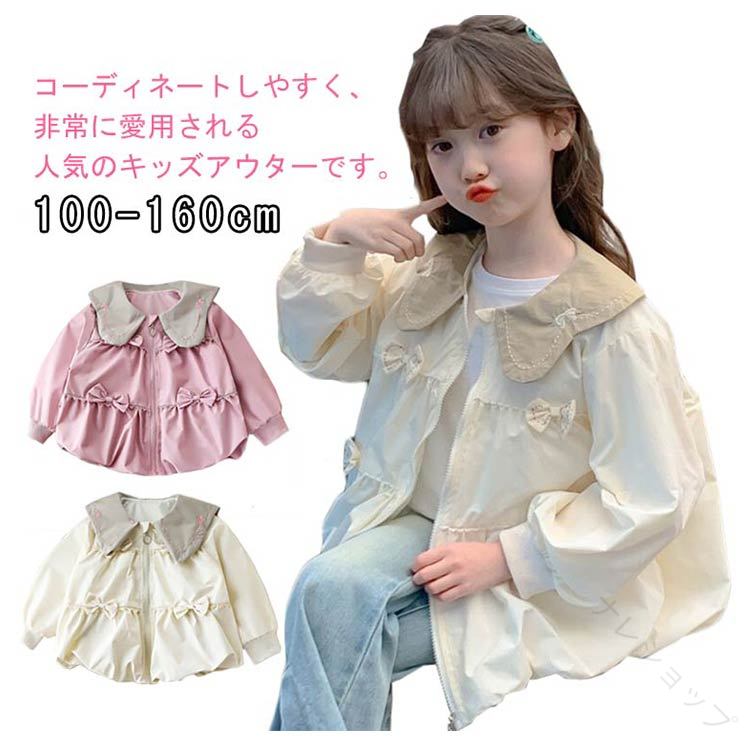 キッズ アウター ジャケット 薄手 上着 襟付き リボン ジップアップ コート 羽織り 秋 春 トップス 子供服 女の子 小学生 通学 ゆったり お洒落 中学校
