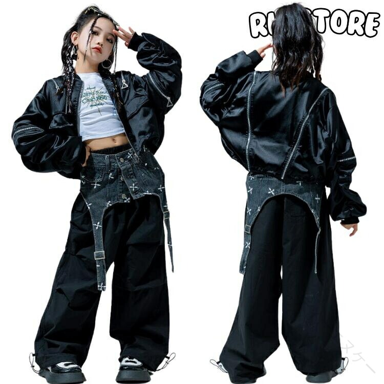 ダンス 衣装 キッズ セットアップ ジャケット 黒 パンツ 長袖 ヒップホップ キッズダンス 女の子 ストリート ダンスウェア おしゃれ レッスン hiphop 原宿系