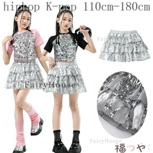 スパンコール スカート キッズダンス衣装 女の子 キラキラ ダンススカート 舞台 演出服 ステージ衣装 ジャズダンス 半袖 黒 粉 Tシャツ 子供服 ダンス服 チアリーダー 応援団 演 団体服