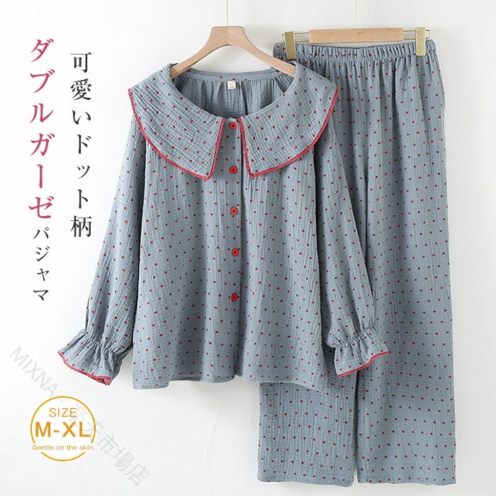 ガーゼ パジャマ レディース ダブルガーゼ ルームウェア 春 秋 長袖 ドット柄 水玉 ロングパンツ ウエストゴム 部屋着 セットアップ 2点セット 寝間着 寝巻き 上下セット 通気性 ふんわり