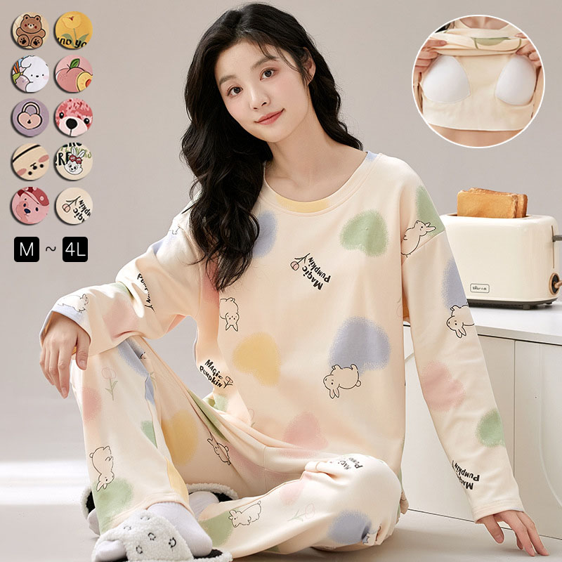 ルームウェア パジャマ レディース パッド付き 取り外し不可 可愛い 長袖 上下セット 春秋 パンツ トップス セットアップ ゆったり 部屋着 寝巻き プルオーバー ドロップショルダー 薄 カットソー