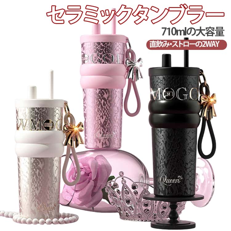 ストロー付き タンブラー 710ml セラミックタンブラー ボトル 水筒 2way 蓋付き 茶こし付き 蝶チャーム付き 真空断熱 保温 保冷 溢れない 漏れにくい コーヒー 炭酸OK オフィ 持ち運び