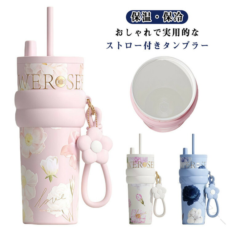 セラミック タンブラー ストローマグ 保冷 保温 真空断熱 ストロー付き マイボトル 水筒 花柄 蓋付き ステンレスボトル