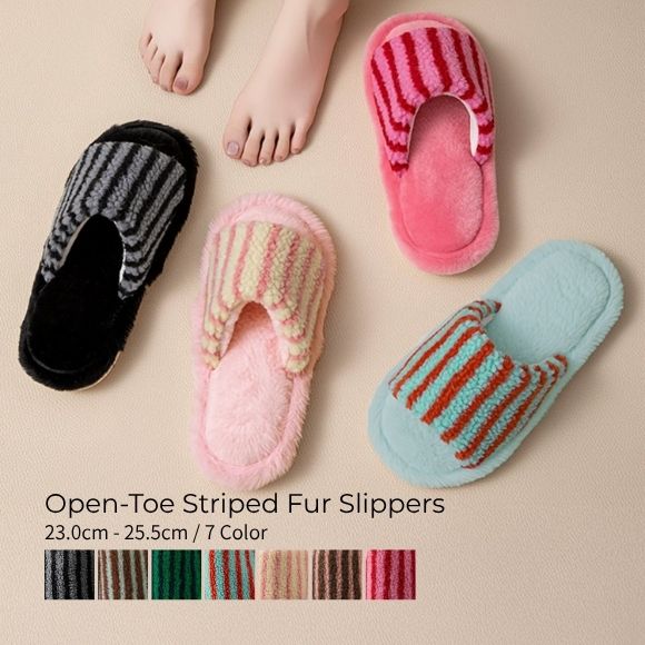 もこもこ&ストライプが今っぽかわいいファースリッパ。目を惹くストライプ柄と、ふわふわのファー素材が絶妙バランス。つま先が開いたオープントゥデザインで、抜け感も◎