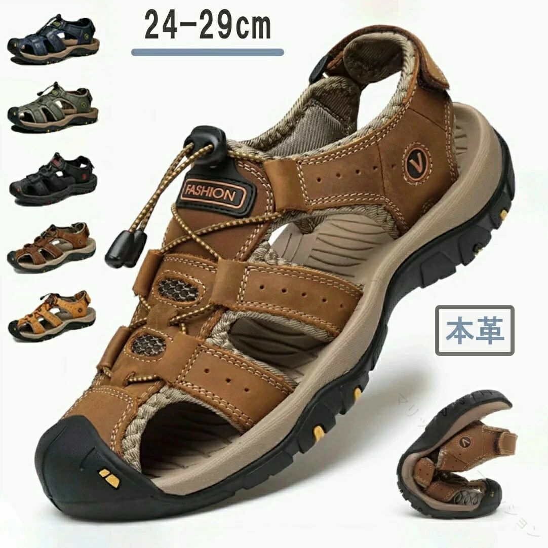 メンズ サンダル アウトドア スポーツ 本革 厚底 つま先 保護 コンフォート 速乾 通気