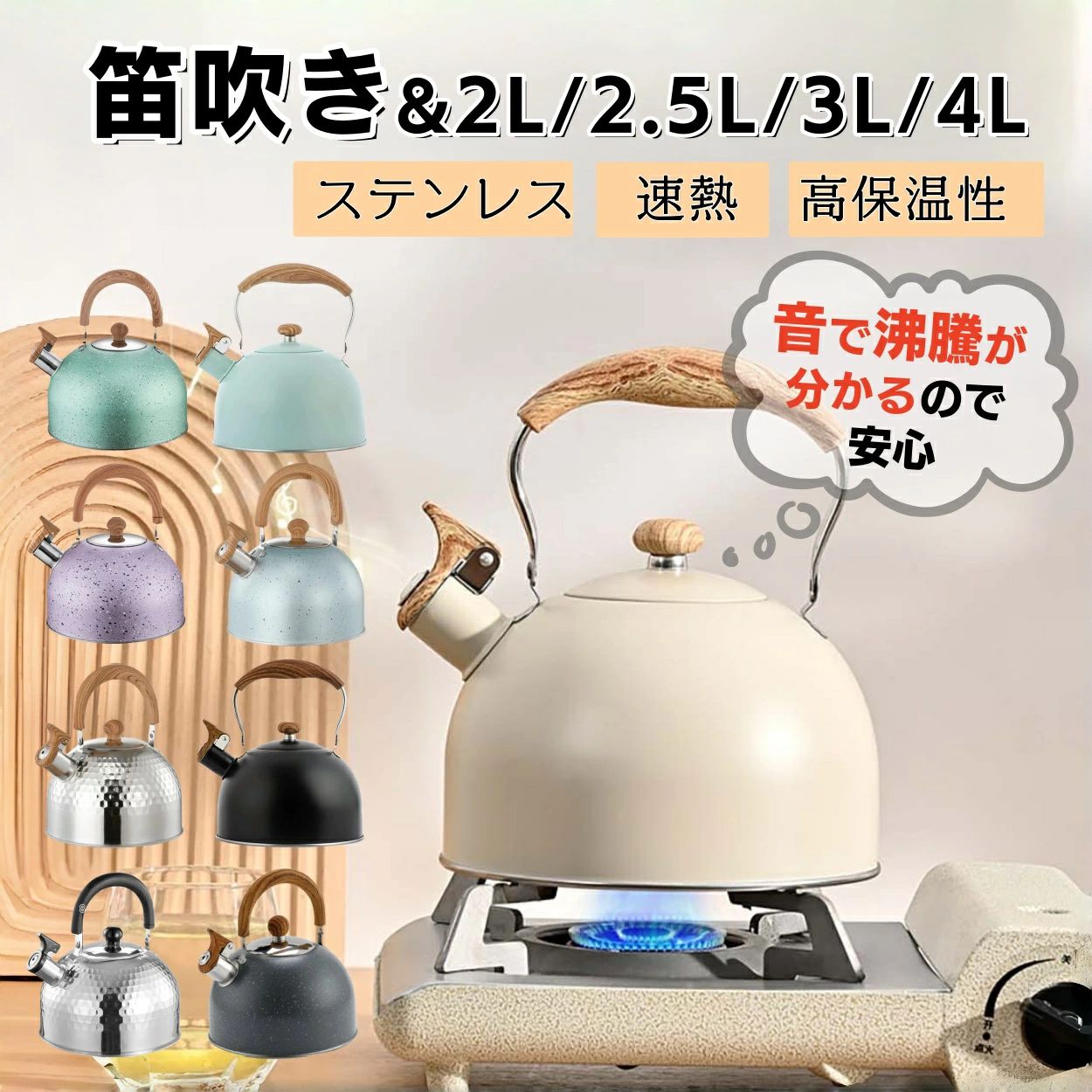 キッ おしゃれデザイン 断熱ハンドル 直火OK ガス火対応 IH対応 広口タイプ 大容量 4L 3L 笛吹きケトル ステンレス製 や 2L