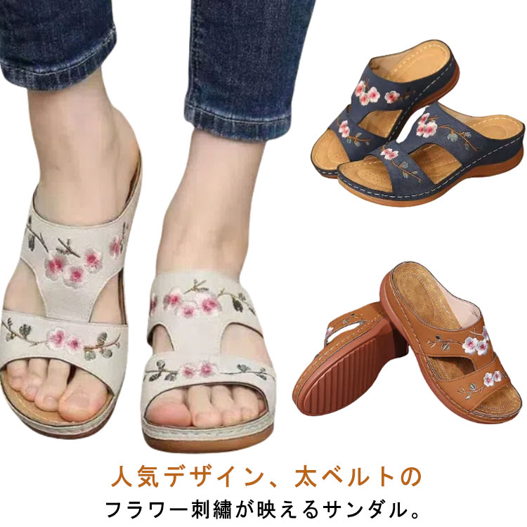 ベルトサンダル 刺 厚底サンダル オフィスサンダル 花柄 コンフォートサンダル ミュール 厚底 レディース つっかけ サンダル まるい 歩きやすい おしゃれ 軽量 軽い ウェッジ 外反母趾