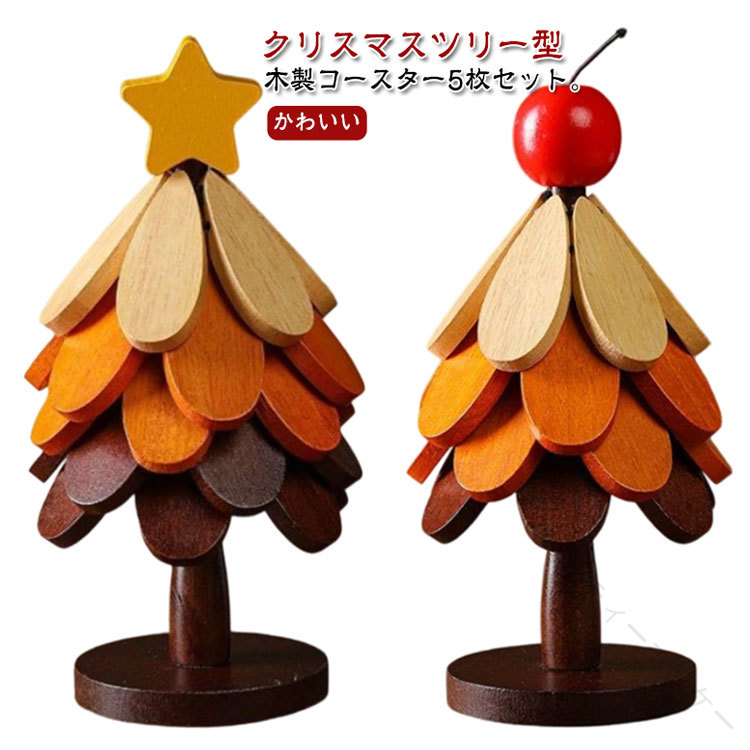 クリスマスツリー 卓上 置物 木製 ツリー クリスマスツリー型 5枚セット 鍋敷き コースター 花モチーフ カップ敷き オブジェ 飾り 食器 茶托 インテリア ミニツリー 敷物