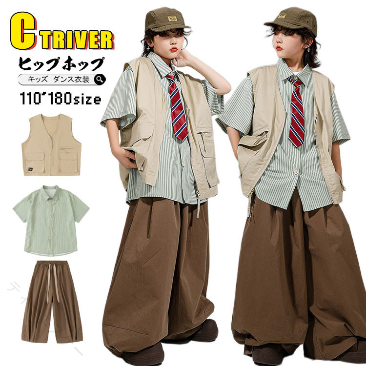 キッズダンス衣装 ストライプシャツ グリーンシャツ ヒップホップ衣装 演出服装 男の子ダンスウェア 女の子ダンスウェア k-pop衣装 ワイドパンツコーデ 個性的衣装 ダンスセット ゆるシアターシャツ