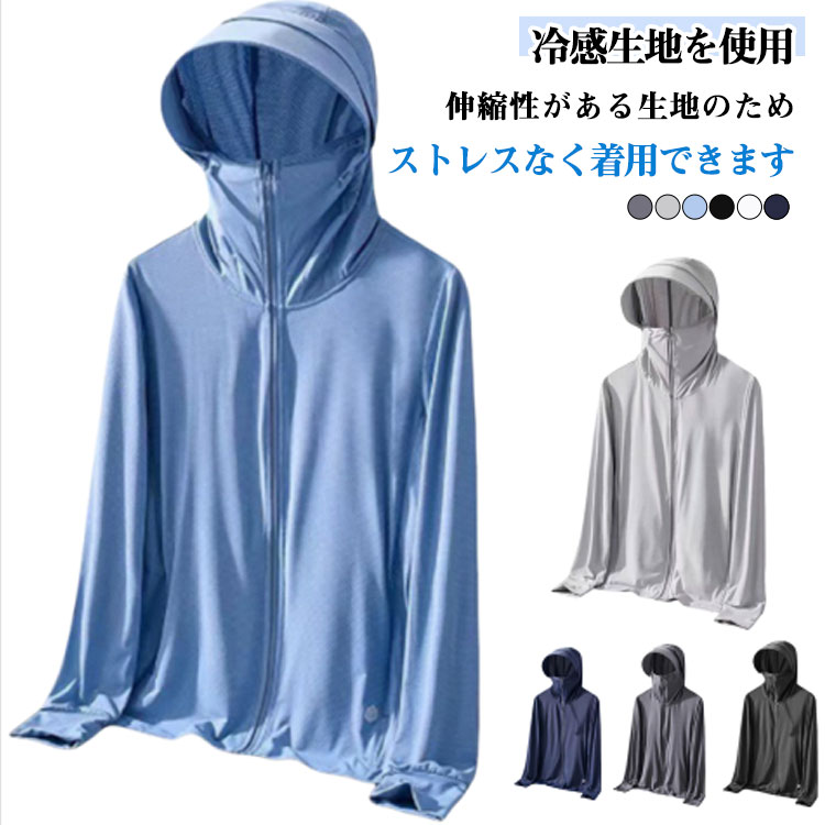 接触冷感 長袖 パーカー メンズ カット パーカー ラッシュガード アウター 指穴 つば 大きいサイズ ライトアウター トップス 薄手 ストレッチ シャリ感 速乾