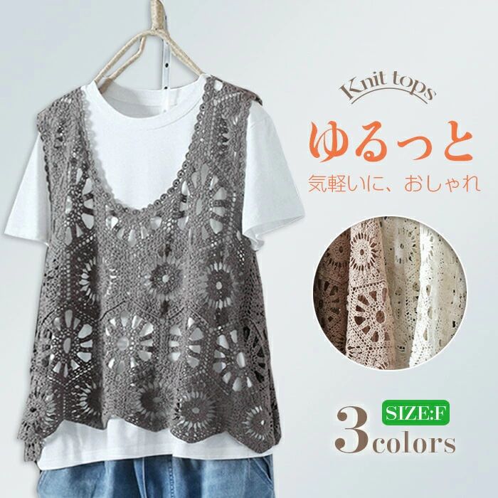 ニットベスト Uネック レディース かぎ編み きれいめ 大人可愛い カジュアル トップス プルオーバー フェミニン 無地