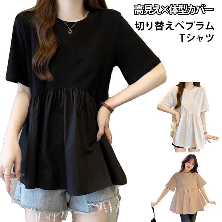 ギャザー トップス tシャツ ペプラム カットソー レディース ドッキング 夏服 カジュアル きれいめ シンプル 体型カバー ゆったり 無地 切り替え ペプラムTシャツ 裾ペプラム 高見え 着回 半袖